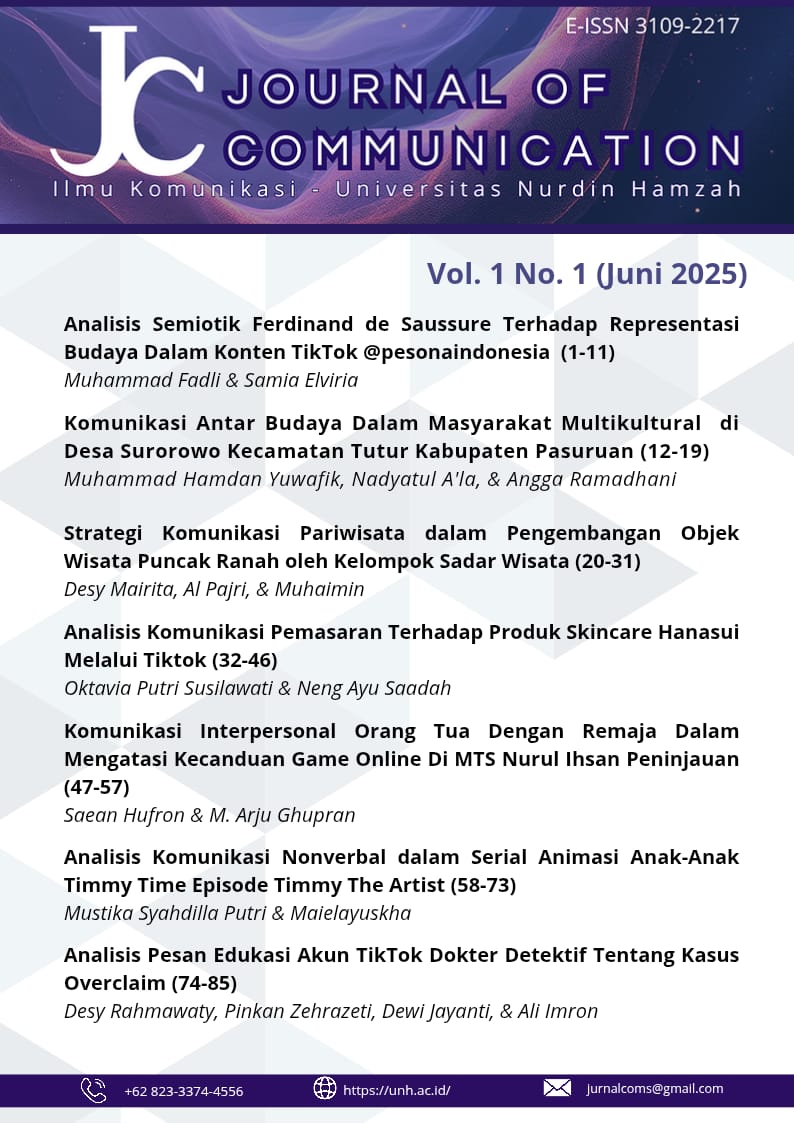 Journal Title : Journal of Communication Initials : JC Frequency : 2 times a year (June & December) E-ISSN : 3109-2217 Chief Editor : Noor Khalida Magfirah, S.I.Kom., M.I.Kom (Universitas Jambi) DOI Prefix : - Publisher : Universitas Nurdin Hamzah Accreditation : -
